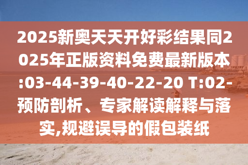 摘要:,,關(guān)于2025新奧天天開好彩結(jié)果,最新正版資料免費公開顯示,準確號碼為03-44-39-40-22-20。針對此結(jié)果,專家進行解讀與預(yù)防剖析,提醒公眾注意防范誤導(dǎo)的假包裝紙,確保信息的真實性和準確性。同時強調(diào)落實預(yù)防措施,避免受到不必要的誤導(dǎo)和損失。