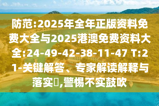 摘要:,,關于防范“2025年全年正版資料免費大全”和“港澳免費資料大全”等宣傳內容,需警惕不實鼓吹。建議注意關鍵解答、專家解讀解釋與落實相關信息。涉及號碼如24-49-42-38-11-47和T:21的,更需審慎對待,以免陷入不實陷阱。公眾應保持警惕,避免被虛假宣傳誤導。