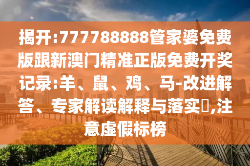 摘要:,,近期揭露的777788888管家婆免費版與新澳門精準(zhǔn)正版免費開獎記錄相關(guān),涉及生肖(羊、鼠、雞、馬)等相關(guān)內(nèi)容。對此,專家提醒,需警惕虛假標(biāo)榜,認(rèn)真解讀解答并切實落實。提醒公眾對于此類免費開獎記錄要保持理性態(tài)度,謹(jǐn)慎對待,避免受騙。