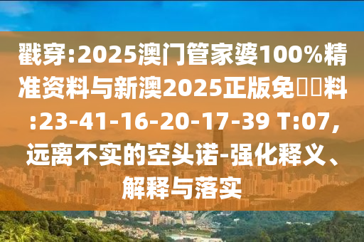 摘要:本文揭露了所謂的澳門(mén)管家婆2025年精準(zhǔn)資料和新澳正版資料的虛假宣傳,提醒公眾注意防范不實(shí)承諾。強(qiáng)調(diào)重視承諾的釋義、解釋和落地執(zhí)行的重要性,遠(yuǎn)離虛假宣傳的誘惑,遵循真實(shí)可靠的信息來(lái)源。同時(shí)提供了一組數(shù)字作為參考,提醒公眾保持警惕,避免受騙。
